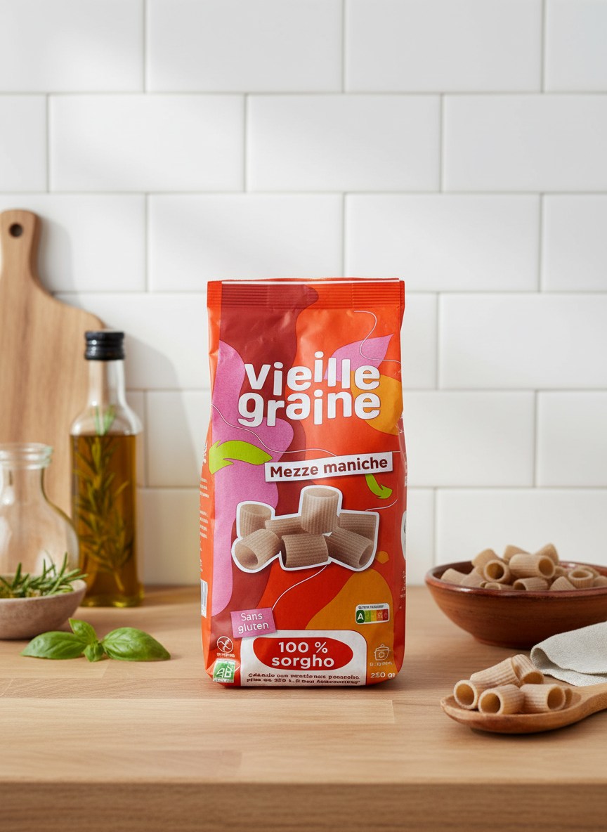 Des pâtes 100% sorgho et sans gluten. Le sorgho est une source de protéines, riche en fibres, en fer, phosphore et potassium, ainsi qu’en vitamines du groupe B, notamment les vitamines B1 et B6. Une excellente tenue à la cuisson et une texture ferme. Les pâtes sont extrudées au bronze pour une bonne adhérence aux sauces.